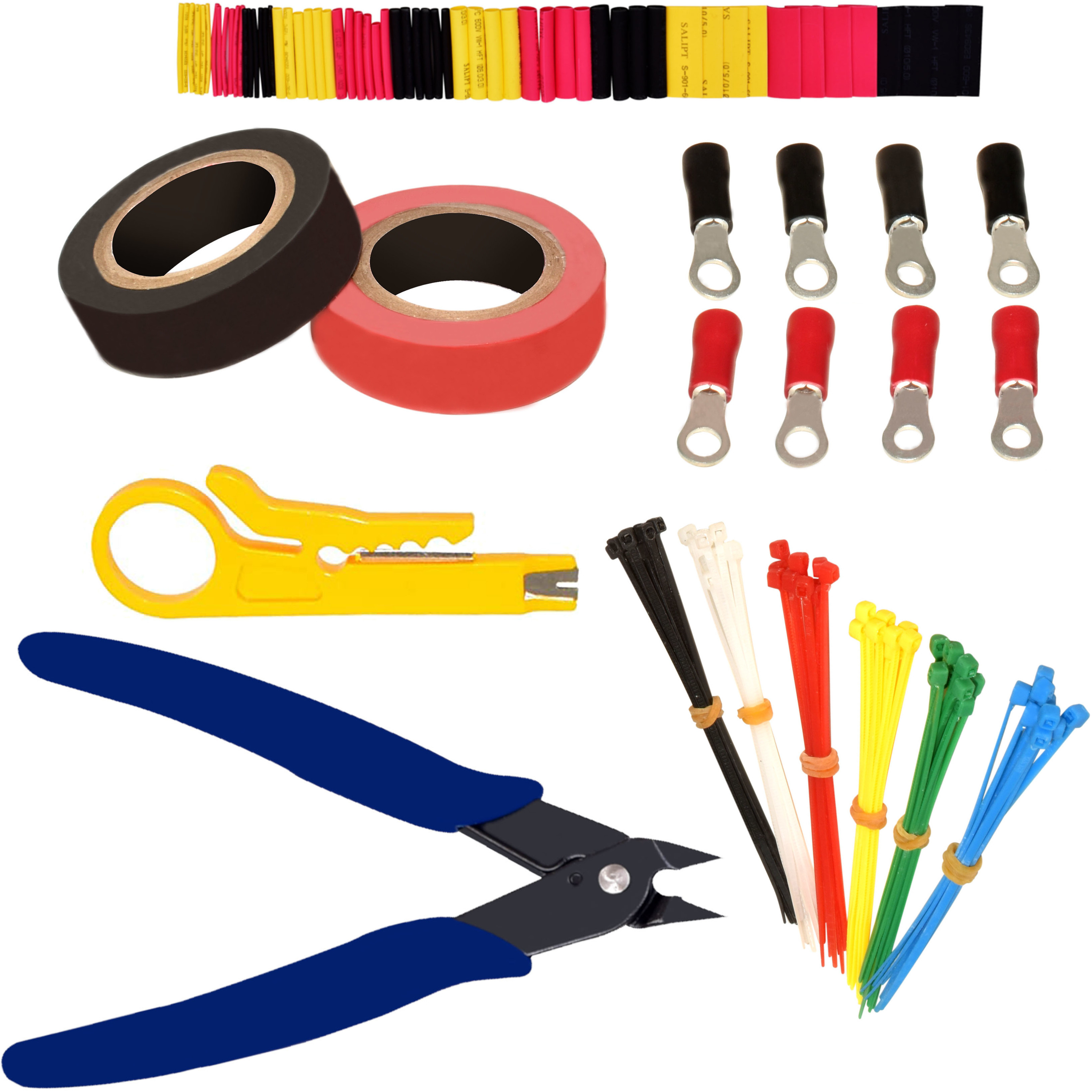The kit includes a set of heat shrink tubes, a diagonal cutter, a mini wire stripper tool, insulation tapes, ring connectors, and colored wire ties, which may be used for other everyday projects.