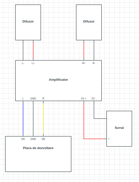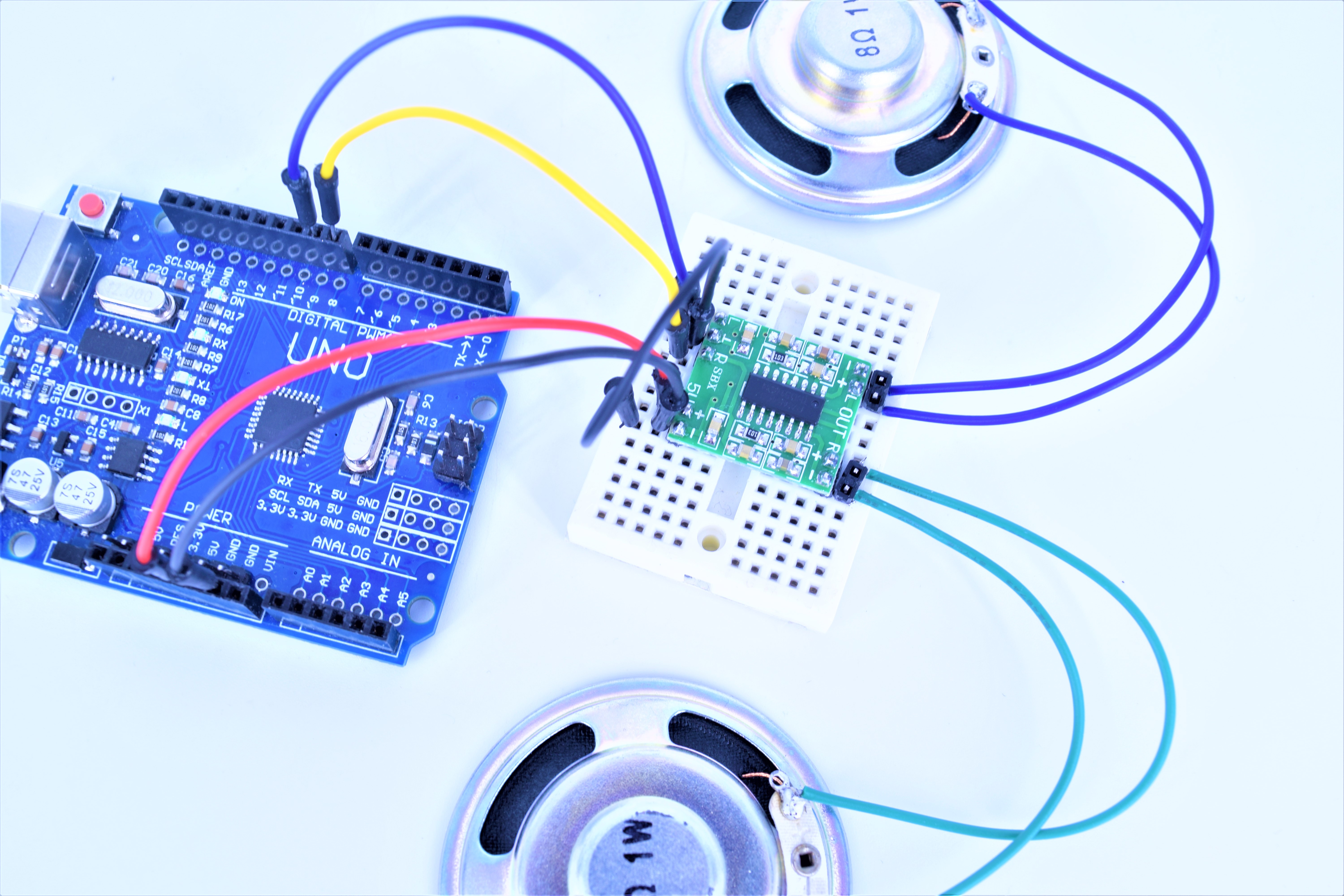 Cel mai simplu mod de a utiliza modulul cu mini amplificator este de a conecta direct difuzoarele la pinii "L-" și "L+" pentru difuzorul din partea stângă și "R-" și "R+" pentru difuzorul din partea dreaptă. Exemple de difuzoare găsiți la această adresă.