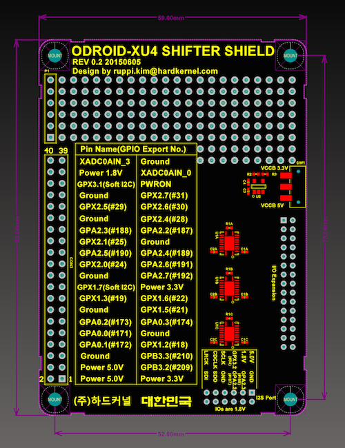 Translatorul conține 3 circuite integrate bi-drecționale TSX0108E. Porturile GPIO de pe XU4 sunt convertite la formatul comun de 0.1 inch (2.54mm). Toate semnalele pot fi translatate la 3.3V sau 5V. Maparea (pindheader-ul cu 40 de pini) este compatibilă cu ODROID-C1 și Raspberry Pi/Pi 2. Pentru folosirea cu XU3/XU3-Lite este necesară modificarea/scoaterea socket-ului cu 12 pini de pe acest shifter.