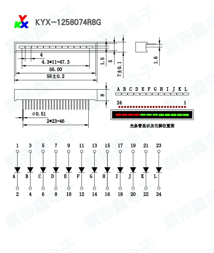 The product is a 12-LED LED bar with two colors: 4 red LEDs and 8 green LEDs. To function properly, each LED needs a voltage drop across it of 1.8 V - 2.2 V and a current of maximum 20 mA, recommended being 15 - 18 mA.